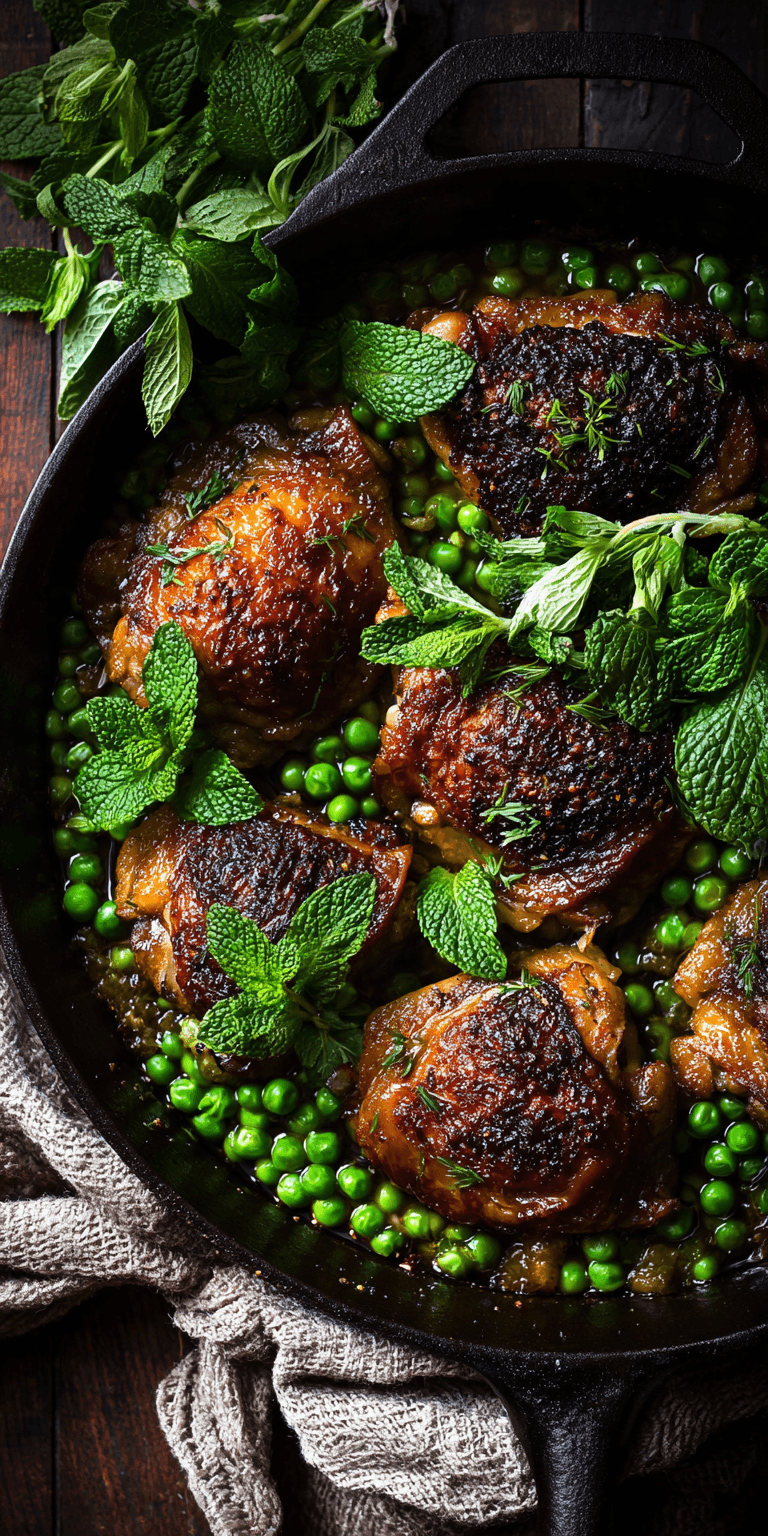 - Nestle the crispy chicken thighs back into the skillet, right into the peas. Sprinkle everything with the remaining mint and a pinch of flaky sea salt. Serve immediately right from the pan.