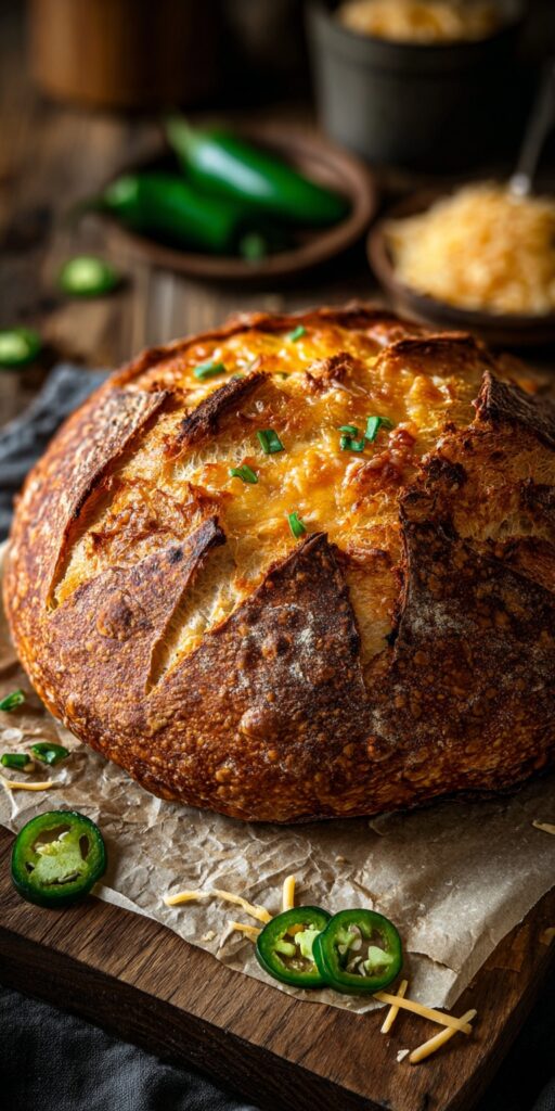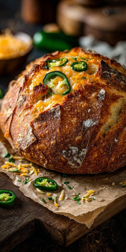 This artisan bread combines the tangy depth of a traditional sourdough with the fiery kick of jalapeños and the rich, melty goodness of sharp cheddar.