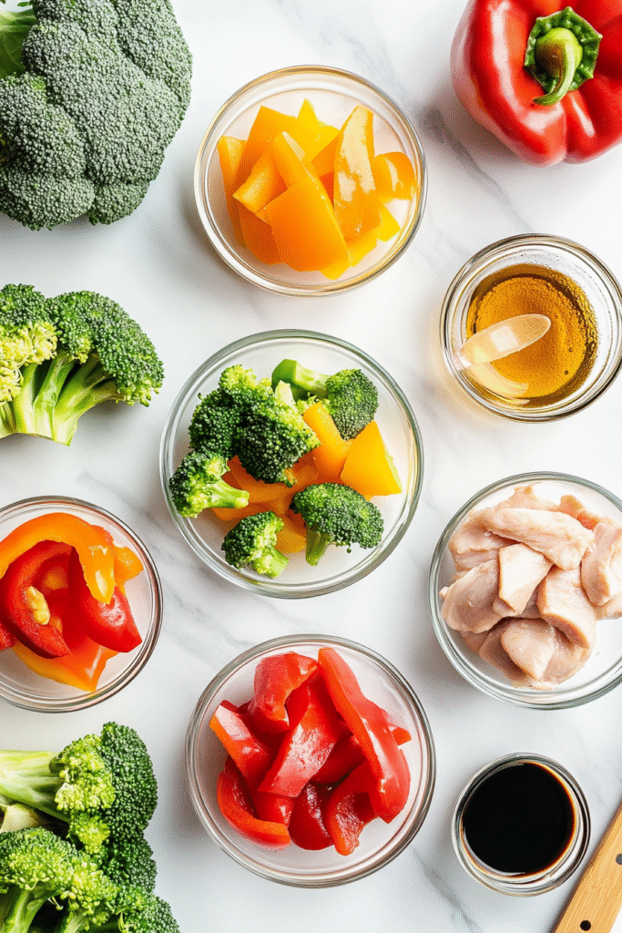 Start by cutting your chicken into small pieces. Slice the bell peppers and rinse the broccoli. In a small bowl, whisk together soy sauce and sesame oil for the sauce. Keep everything ready.